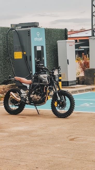 Color coding is a critical aspect of electric bike wiring diagrams, ensuring safe and efficient connections. Red wires typically represent positive terminals, while black wires denote negative or ground connections. Yellow wires often control the throttle, green wires handle brakes, and blue wires may connect lights or horns. These colors help avoid confusion and prevent dangerous short circuits. Always verify the color assignments in the diagram’s legend, as they can vary by manufacturer. Properly following the color coding ensures components function correctly and reduces the risk of electrical damage or safety hazards; Consistency in wire colors simplifies troubleshooting and maintenance, making it essential for both novices and experienced users.